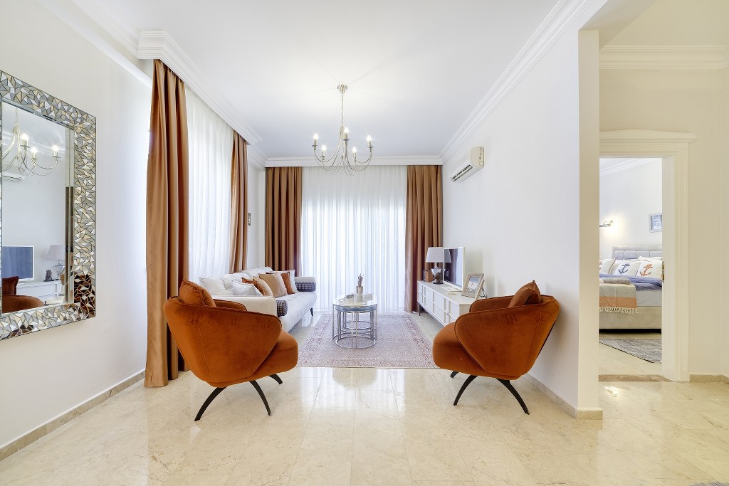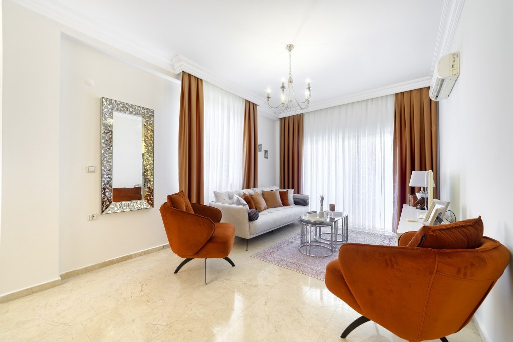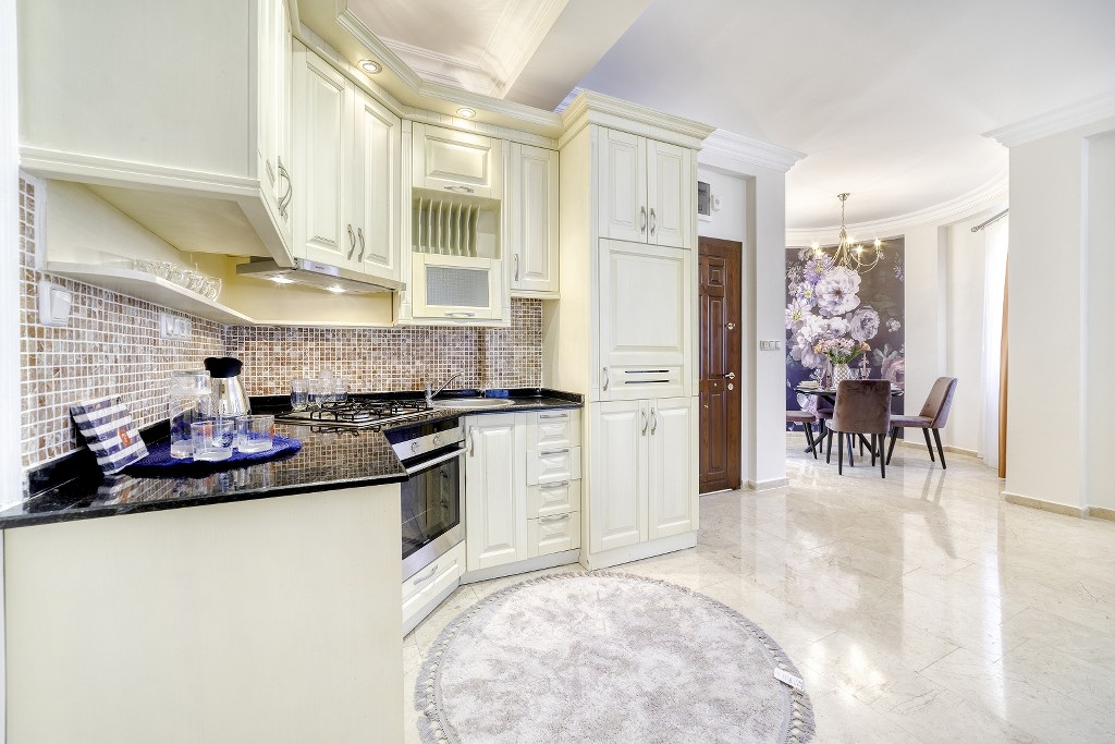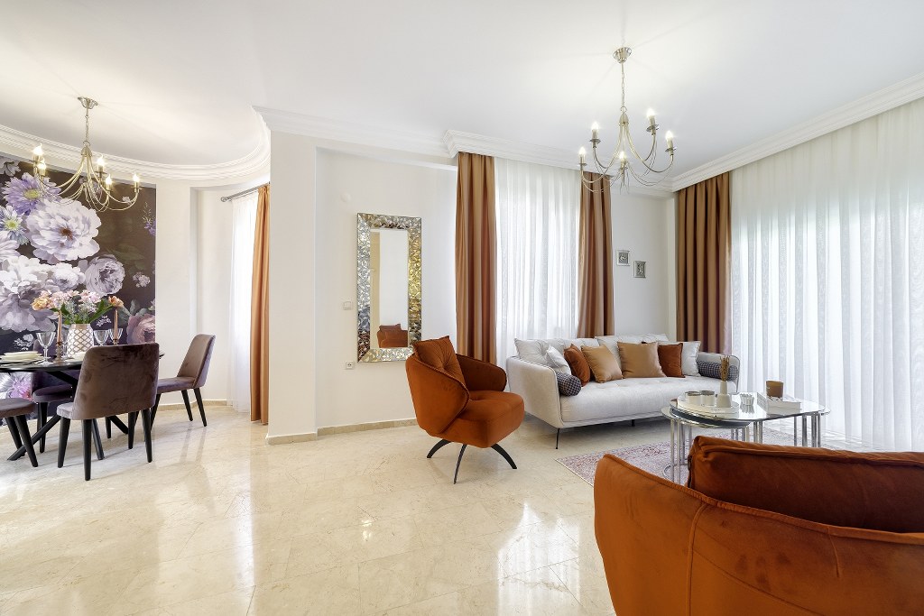 Full lüks eşyalı ve yaşam için hazır bir daire.Mobilya,beyaz eşya,klima,çamaşır makinesi,bulaşık makinesi,balkon masası.